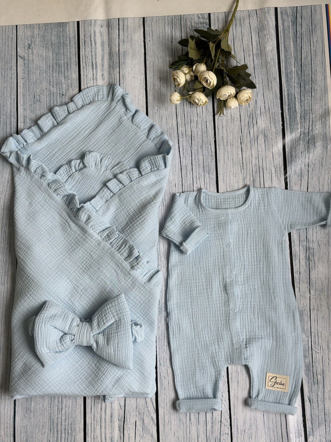 Теги: Купить детские конверты, комбинезон оптом, детские конверты на выписку оптом. 335-Г. Комплект из детского комбинезона, р 56 и конверта муслин, хлопок 100% 90/90 см, голубой цена,отзывы официальный сайт "Стеша Новоуральск"