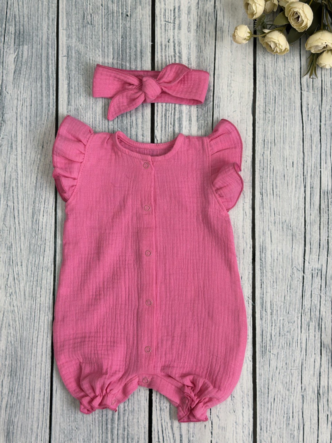Купить оптом 341-Ф. Песочник с повязкой для девочки из муслина, хлопок 100%, р 62,68,74,80 фуксия в Новоуральске